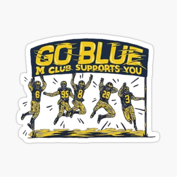 The banner, reading "Go Blue: M Club Supports You", is raised at midfield before every Michigan home game. Michigan players run from the Michigan Stadium tunnel as the Michigan Marching Band plays "The Victors". As the players approach the banner, they leap to touch it.